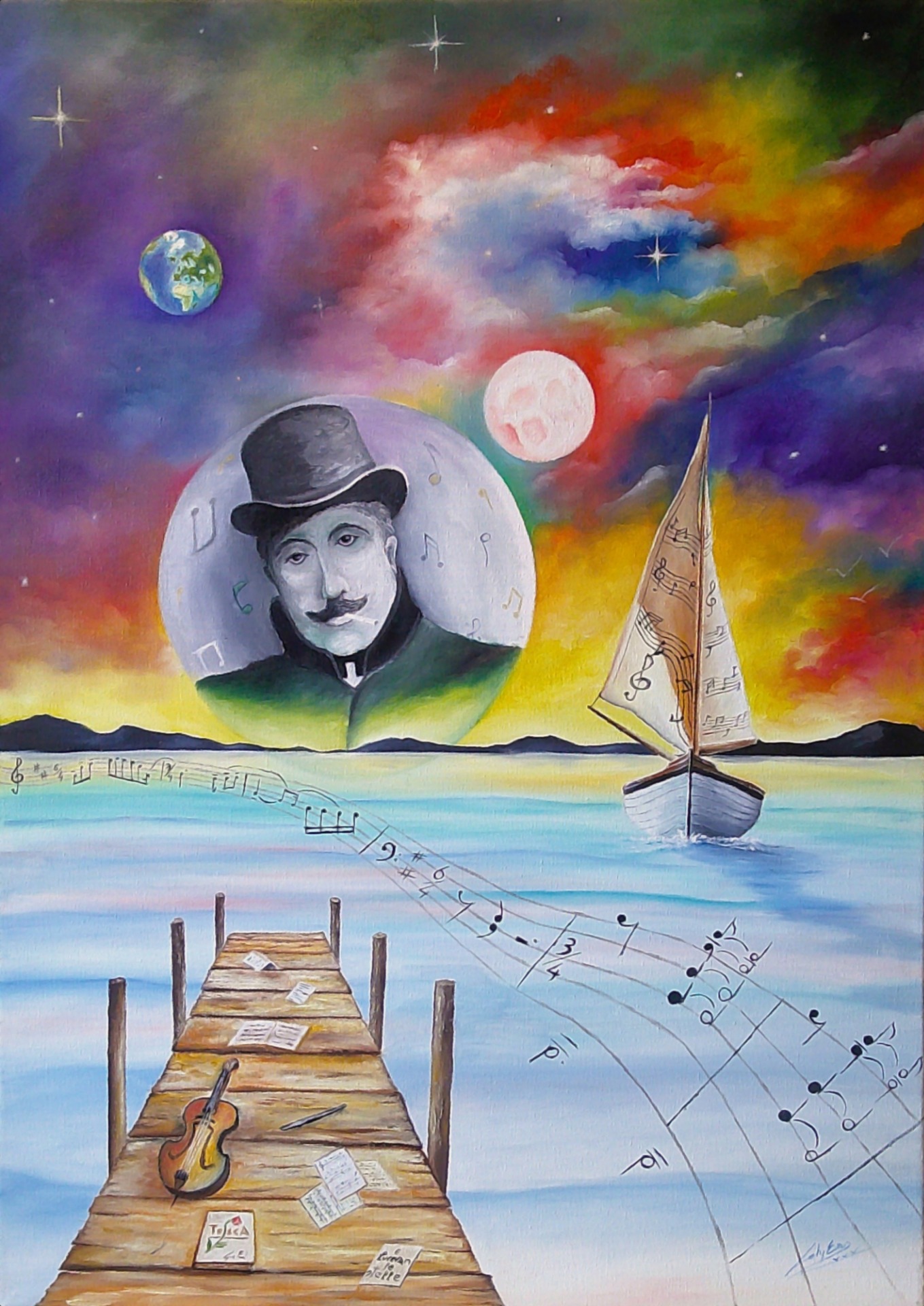 Dipinto ad olio su tela 50x70. Io che abito in provincia di Lucca ho voluto dipingere questo quadro in omaggio a Giacomo Puccini per il centesimo anniversario della sua morte. Era un grande musicista toscano autore delle piu' famose opere del fine 800 e inizi 900 come la Bohème, la Turandot, la Tosca e in particolare rappresenta la suonata dal titolo E LUCEAVAN LE STELLE.