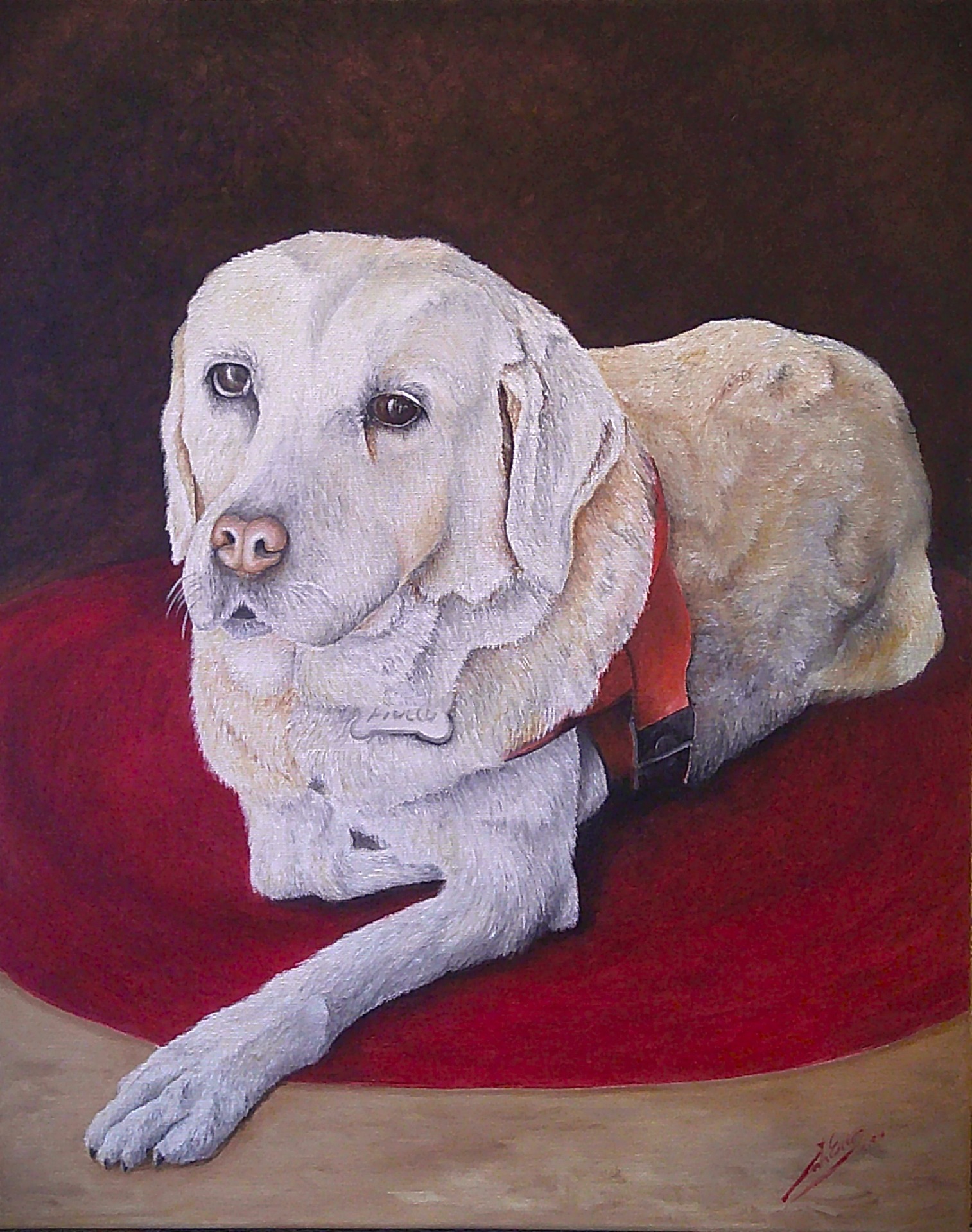 Dipinto ad olio su tela 50x40. Fiocco è un cane labrador dallo sguardo dolce ma allo stesso tempo triste e buono. Si trova in provincia di Milano con i suoi amati padroni. Hanno voluto questo mio dipinto come loro regalo di Natale e mi ha fatto molto piacere.