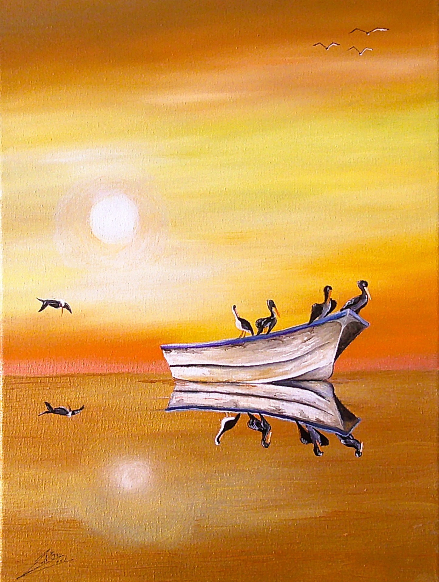 Dipinto ad olio su tela 30x40. Alle volte le vecchie barche hanno una seconda vita come casa per gli animali. In questo caso dei pellicani sono immortalati mentre si godono il silenzio del tramonto.