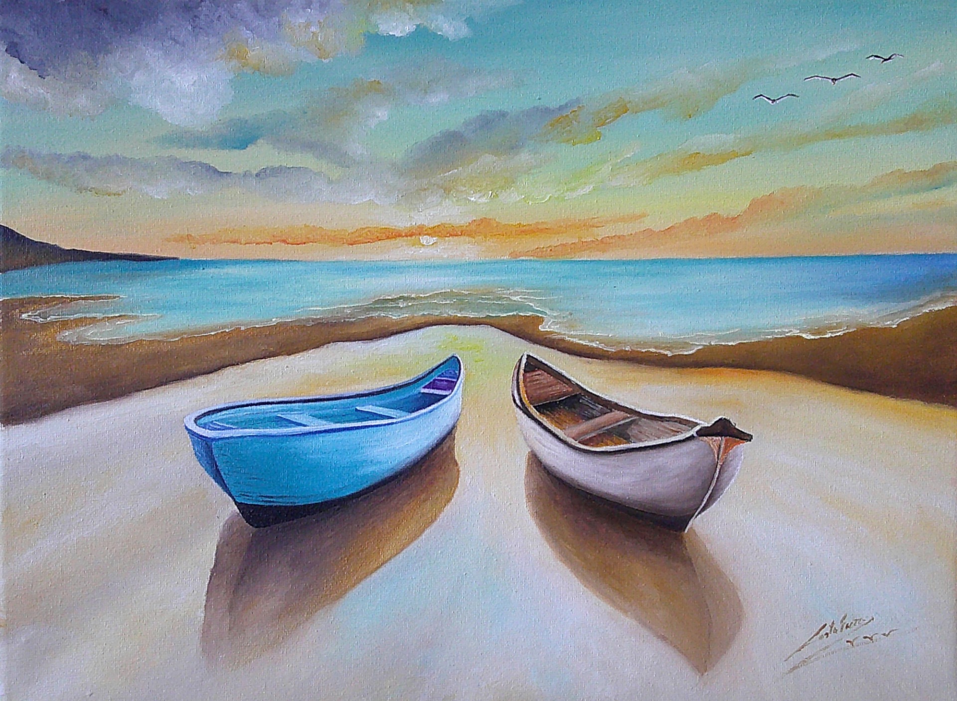 DIpinto ad olio su tela 30x40. Ma quanto sono belle le barche all'alba quando i colori del cielo riflesso nel mare si mischiano tra loro. Mi assaporo il silenzio assoluto seduto sulla barca con lo sguardo rivolto verso l'alba.