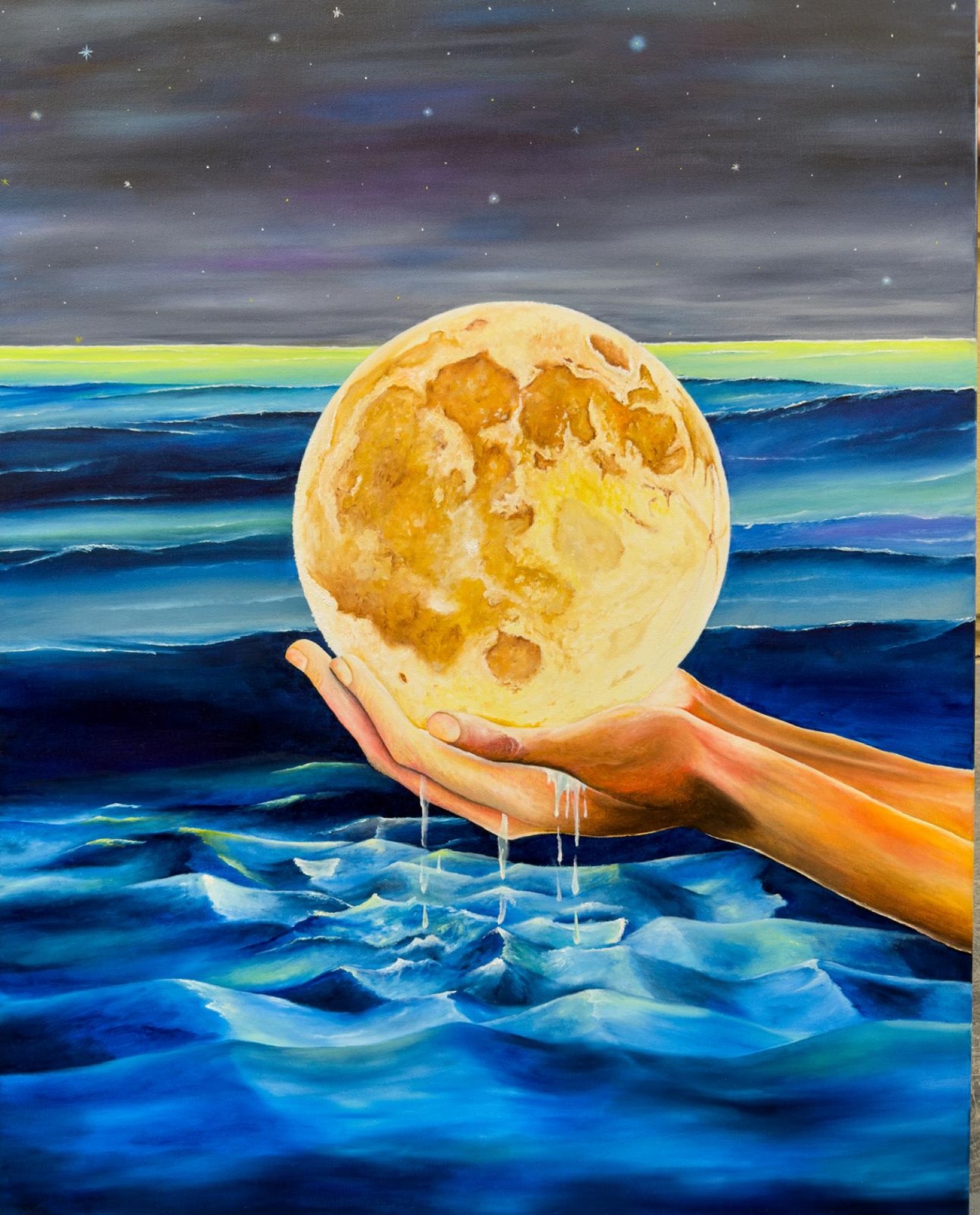 Dipinto ad olio su tela misure 80x100. Questo dipinto offre una profonda riflessione sul significato del dono fatto col cuore. Regalare la luna simboleggia un amore o un affetto smisurato e incondizionato, non è tanto il risultato a contare ma la purezza dell'intenzione e la volontà di sfidare ogni limite compiendo un gesto che è per sua natura impossibile.